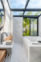 A convivência foi uma prioridade, refletida na área externa com uma grande mesa que se integra ao deck de apoio, emoldurando a paisagem. A esquadria estabeleceuma conexão fluida entre o interior e o exterior, enquanto o chuveirão integrado ao paisagismo oferece uma experiência ao ar livre em meio à natureza. A combinação de madeira e verde reforça a leveza e a poética do espaço, evocando o aconchego de um quintal arborizado. A Área Gourmet, o coração vibrante do apartamento, é perfeita para churrascos em família e com amigos, e sua integração com o exterior é garantida pela cobertura de vidro que proporciona abundante iluminação natural.
